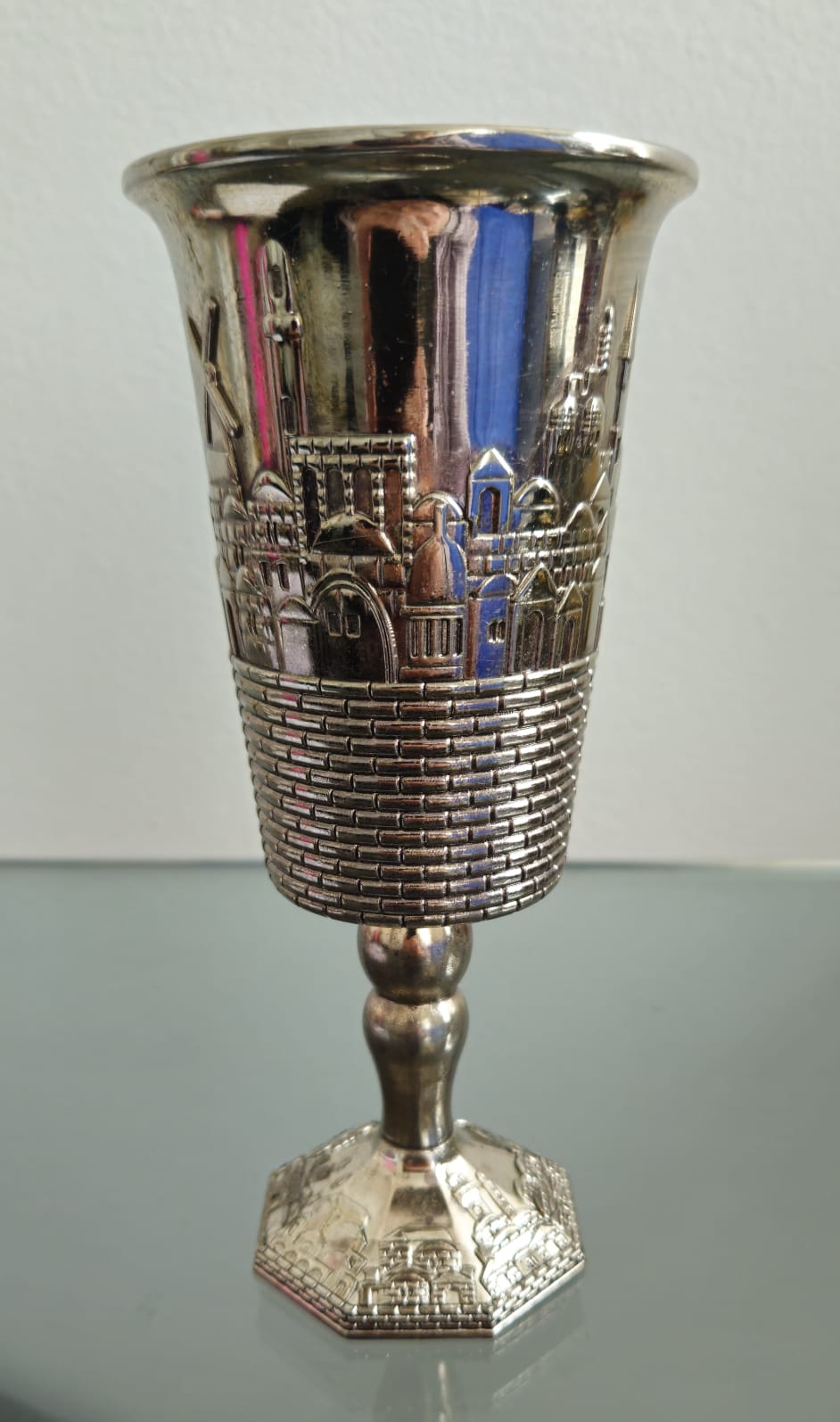 Cálice para Kidush em metal prateado com detalhes em relevo. Medidas 16 cm altura x 7 cm diâmetro. *** marcas do tempo / uso