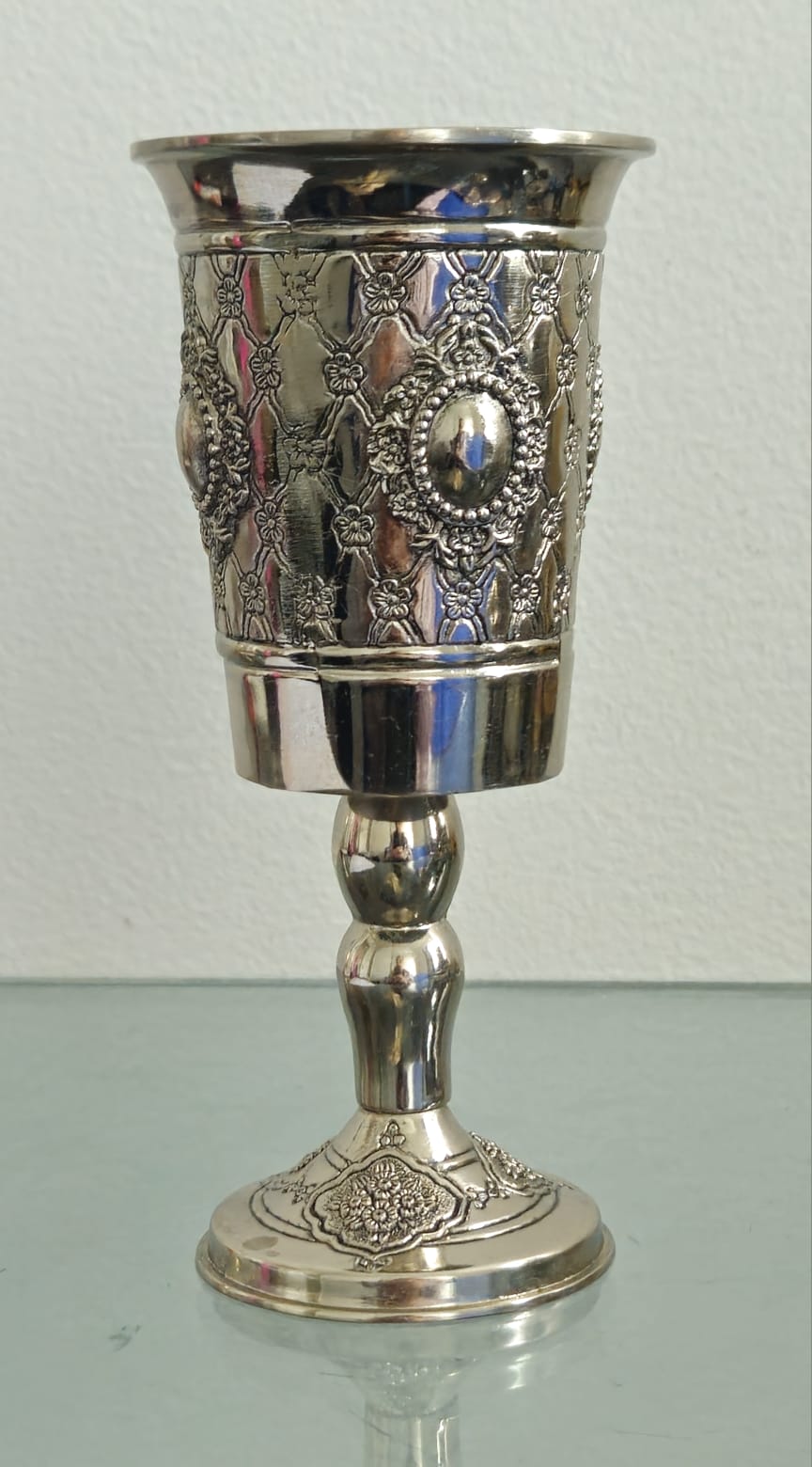 Cálice para Kidush em metal prateado com detalhes em relevo. Medidas 15 cm altura x 7 cm diâmetro