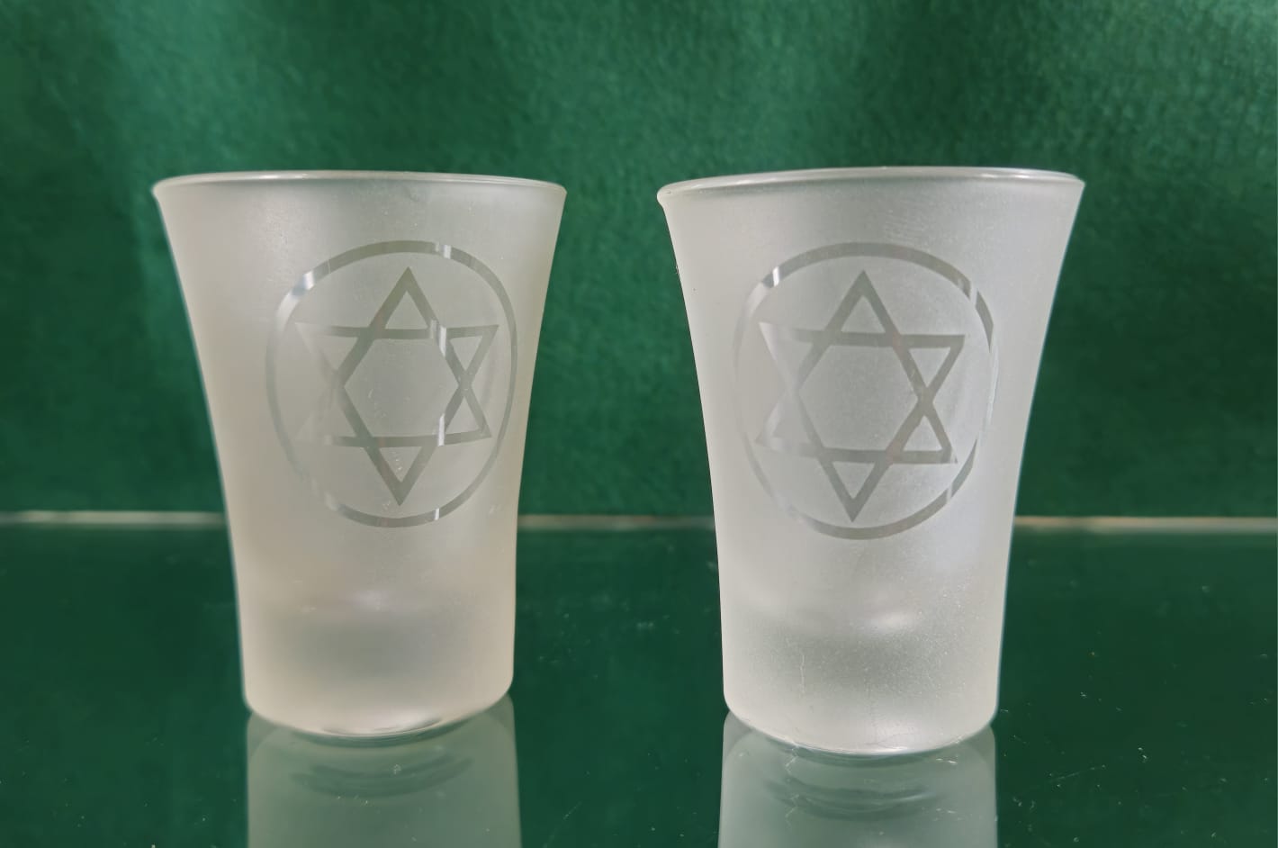 Par de copos com Maguen David. Medidas 7cm altura x 5 cm diâmetro.