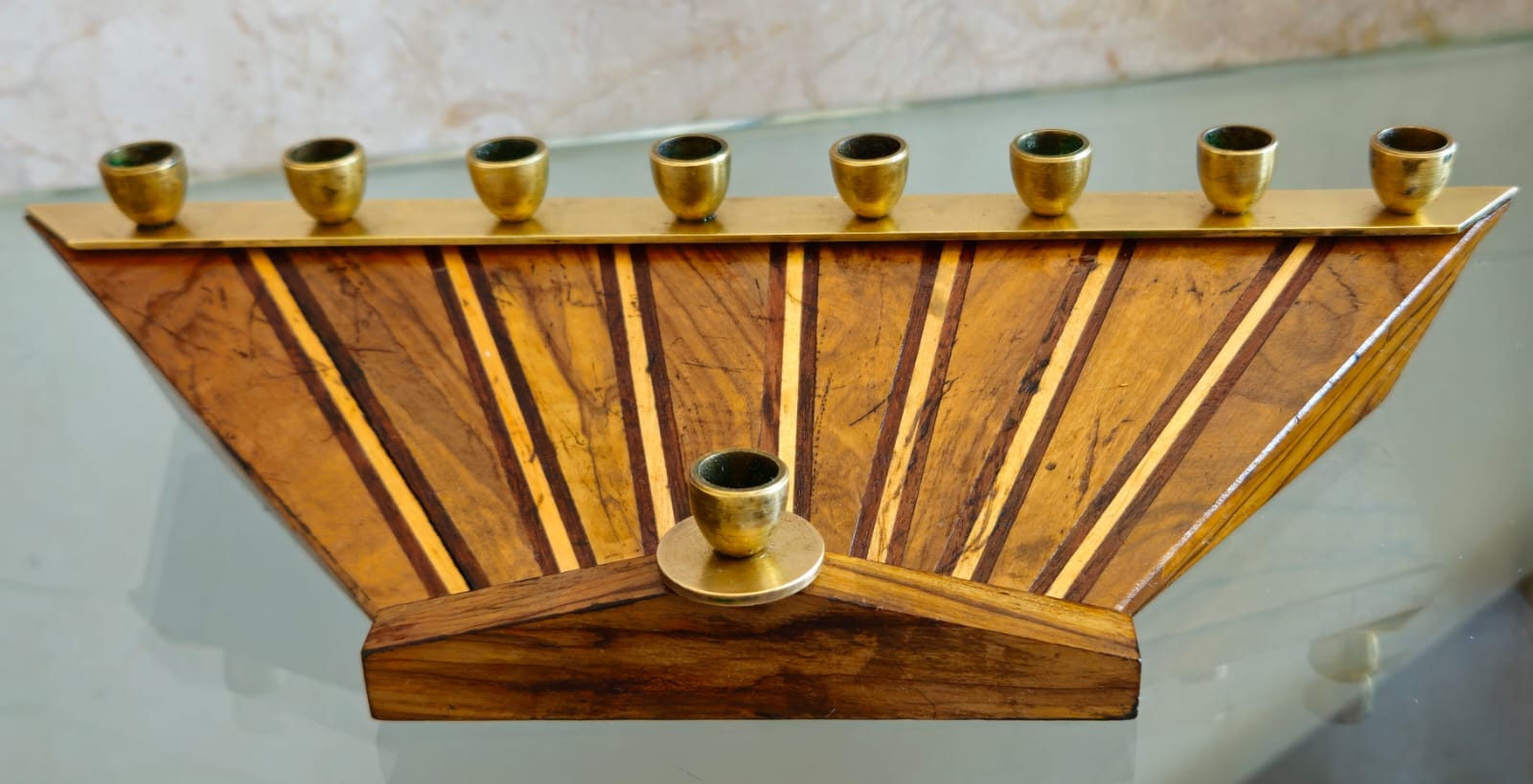 Chanukiá em madeira e metal. Medidas 5 cm (altura) x 24 cm (comprimento)