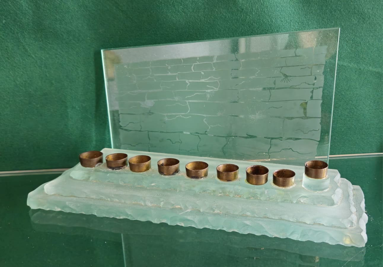 Chanukiá em vidro. Medidas 18 cm (altura) x 28 cm (comprimento) x 9 cm (largura)