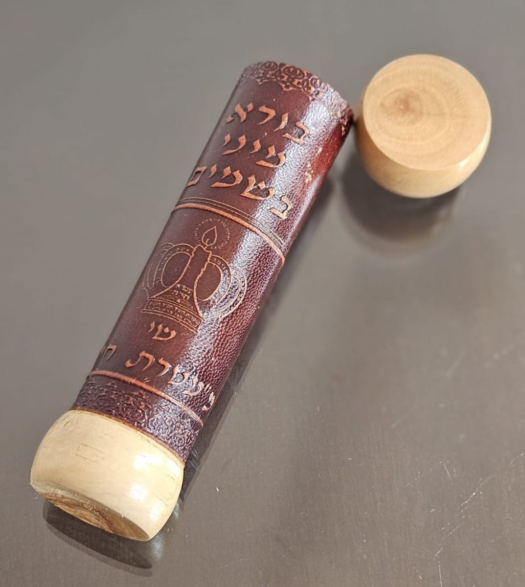 porta meguilá judaico, em couro e madeira