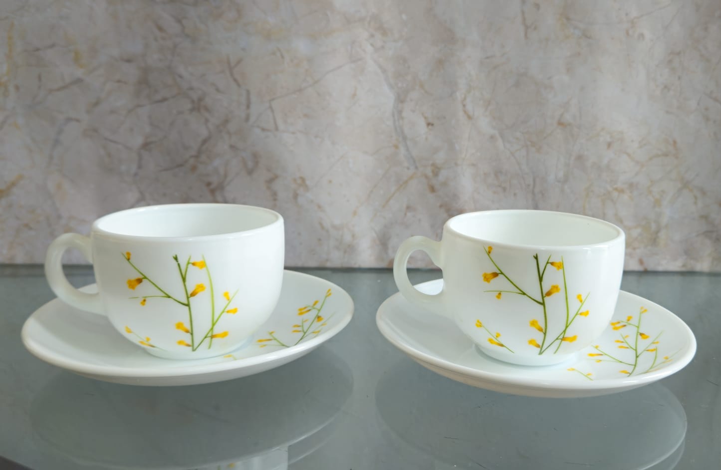 Par de xícaras de chá em porcelana. Medidas 13 cm diâmetro do pires, xícara com 6 cm altura e 7 cm de diâmetro.